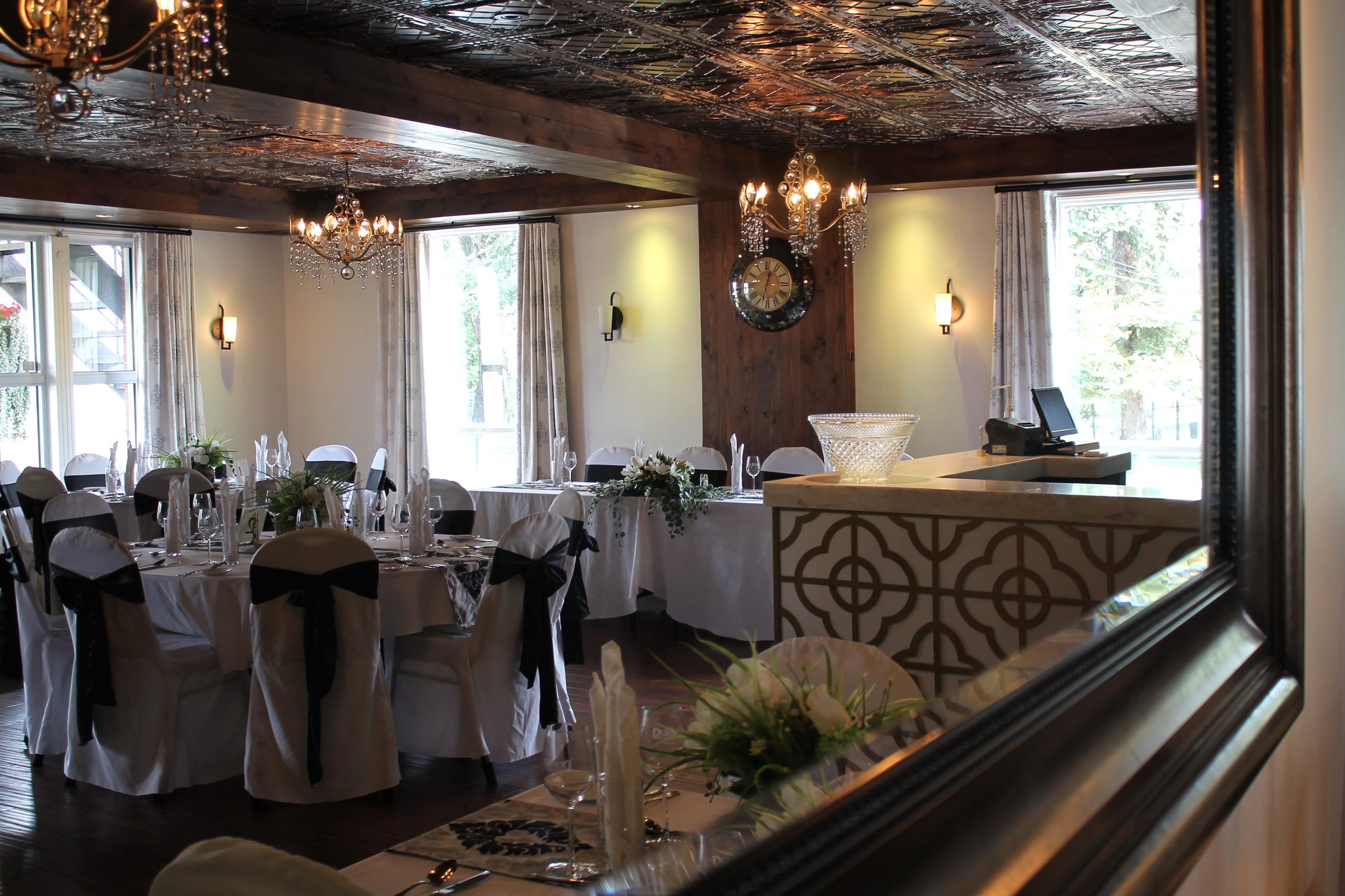 Cette magnifique salle offre intimité et chaleur grâce à ses matériaux nobles et son design rustique contemporain complétés par de belles boiseries. L’entrée principale donne sur un beau grand balcon couvert pour ajouter à son charme.